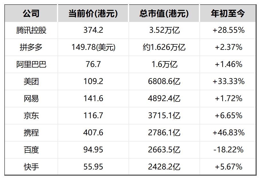 阿里港股的表现也不容乐观。以今年6月3日为例,阿里市值仅从年初增长1.46%至1.6万亿港元。这个市值不仅不如拼多多,而且在国内头部互联网公司中也处于底部。