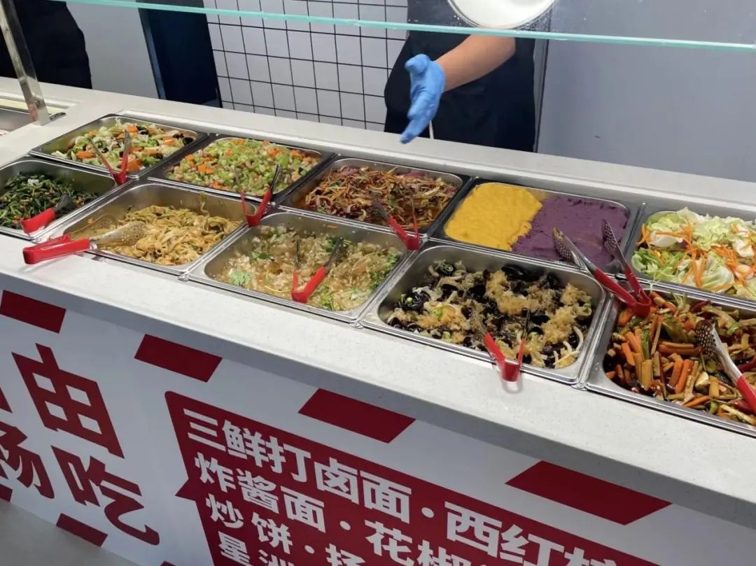 中午11:00,食堂已经有很多人来了。一半的桌子已经挤满了,还有一些人在排队做饭。据悉,这里采用的是自助餐式流程。自助餐有两种,一种是13元的碳水化合物自助餐,包括几种面条、蛋糕、粉末、馒头、炒饭等。另一种是19.9元的自助餐。有近20种热菜和凉菜,还有晚餐、水果和甜点。午餐和晚餐分时供应,有些菜肴如鸡腿、肉丸等限量供应,售后不补。