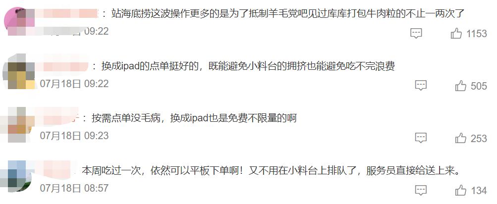 7月18日,#海底捞回应小料台没有牛肉颗粒#这个话题在微博热搜中排名第一,称“我们部分门店在小料台试点了新产品,因为位置有限,所以会在iPad上调整了牛肉粒那个。”与此同时,很多网友在社交平台上反馈,需要在iPad上点牛肉粒,“限量供应”!对此,海底捞客服也回应说:“配料按位收费,不限”。