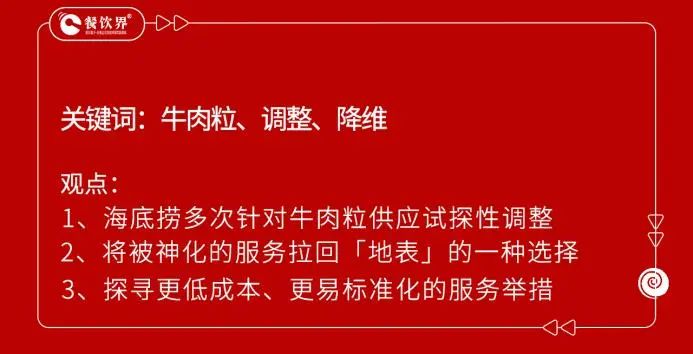 从牛肉粒的调节节奏来看,海底捞服务的“降维”之旅“谨慎”,海底捞希望走得更稳。以海底捞为代表,在求变、求稳的同时,已成为火锅行业的主流节奏。。