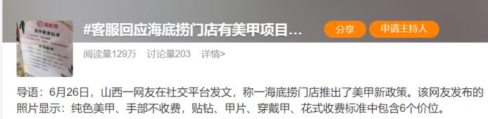 另一方面,海底捞开始试探更有利于成本优化、更便于标准化管理的服务措施。。与优化牛肉颗粒几乎同时,海底捞已经免费等待美甲和付费项目。对此,海底捞回应媒体称,原本免费的项目属于基本款...有些店铺可以根据自己的区域和商业区的情况,根据不同客户群体的需求增加各种图案的美甲选择。在餐饮行业(canyinj.com)看起来,这是一种必然的选择,海底捞是一种选择,它将被神化服务拉到“地表”。。