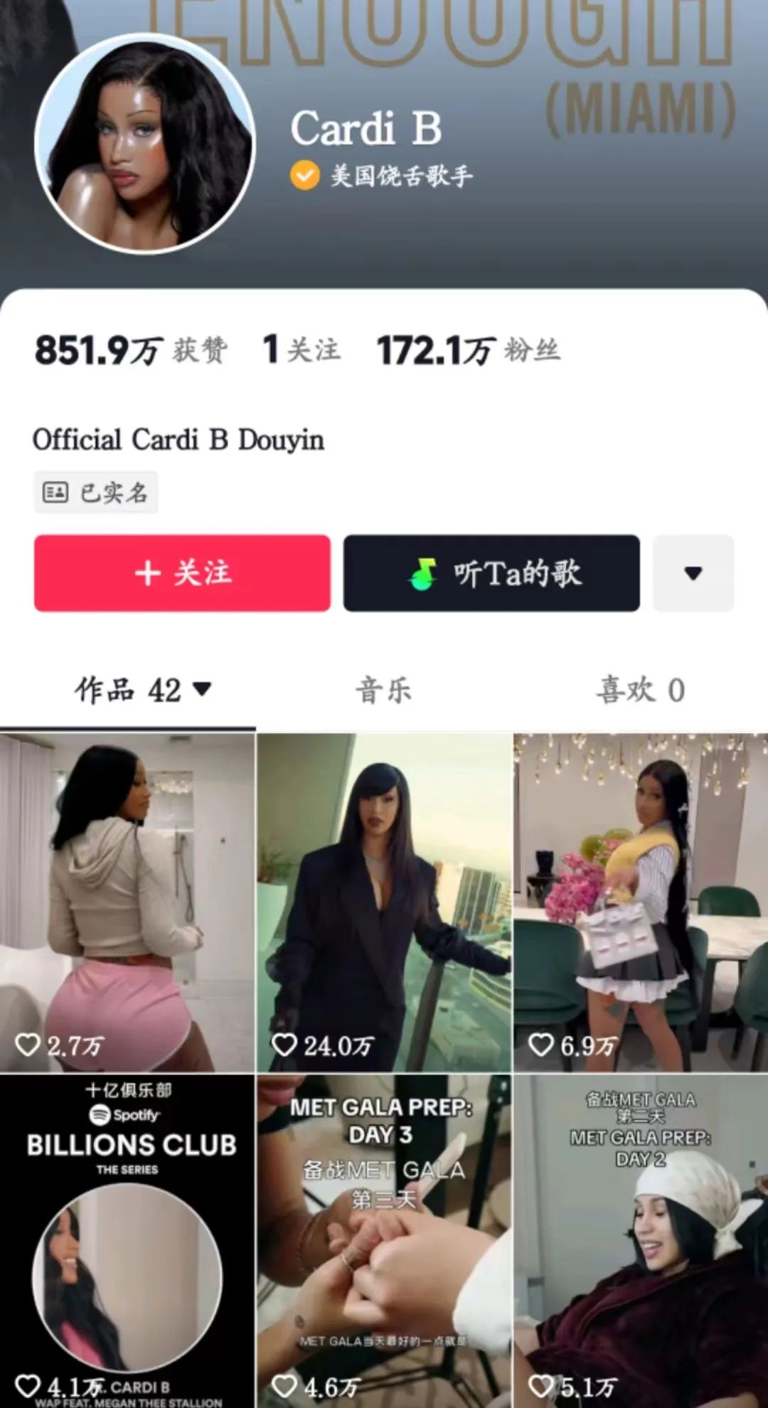在少数打破这种困境的海外艺人中,Cardi B算其一。去年九月,Cardi B一口气继续进入小红书,微博,抖音。进驻当日,Cardi B在三个平台上分别发布了拍摄给相应平台的中国粉丝的原创视频;其中,抖音账号单日上涨10万粉。到目前为止,虽然三个账号的粉丝总数还不到300万,后续发布的内容主要是处理,但是账号评论区的活跃度一直很高。
