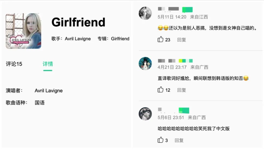 早期发行的艾薇儿《Girlfriend》《Hot》都有中文版。虽然艾薇儿的中文发音已经很标准了,但是中文版的歌词是英文歌词的直译。这就是为什么那个还没有。 AI 在背锅时代,这两个中文版一度被误认为是乐迷自己创作的。