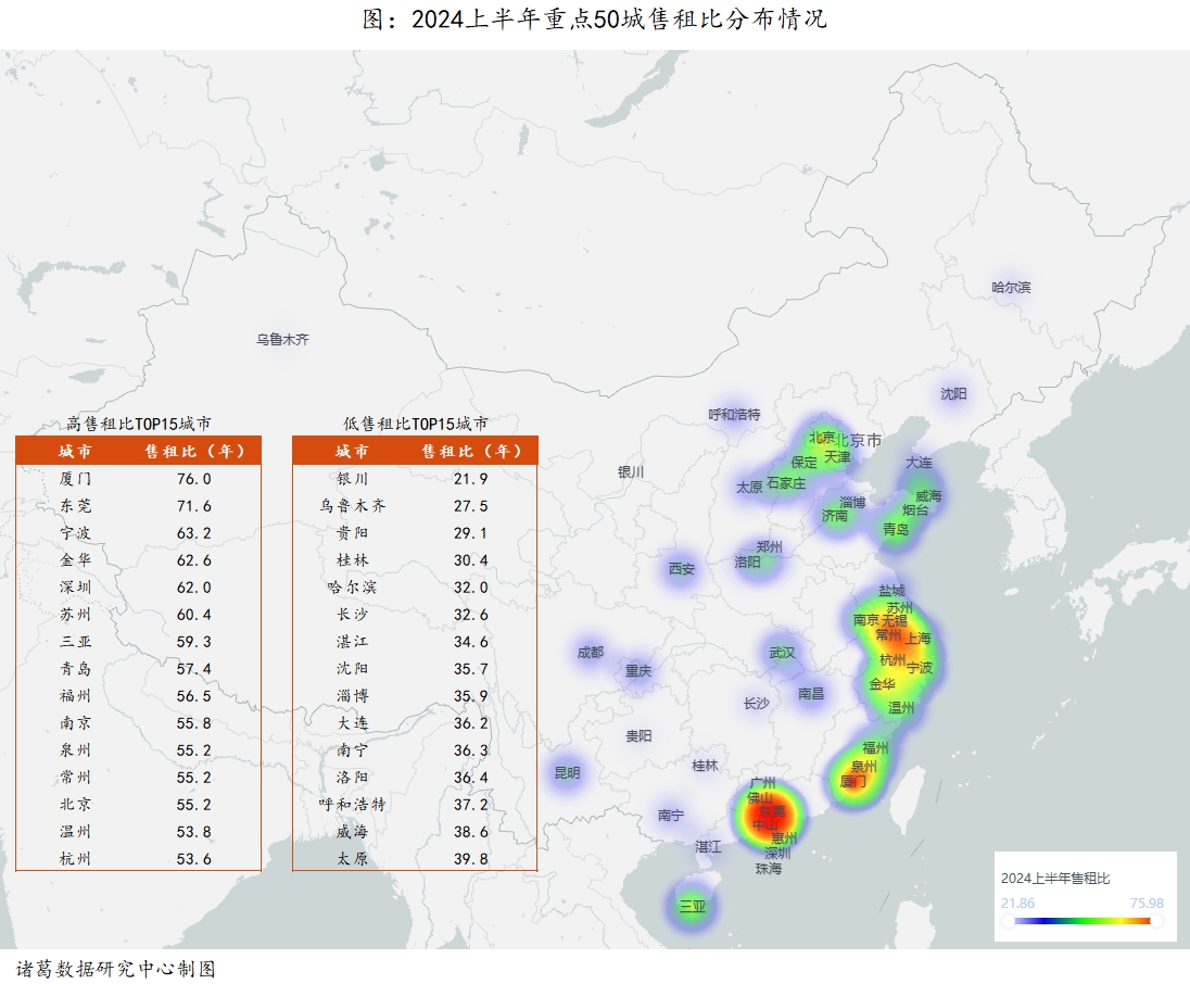 根据诸葛数据研究中心的统计数据,2024年上半年50个城市的平均租金为33.29元/元。㎡与2023年相比,每月下降1.18%。;19640元/平均房价㎡,与2023年相比,房价下降4.65%,房租下降幅度超过房租下降幅度,房租偏差连续两年下降,回到2019年的水平。