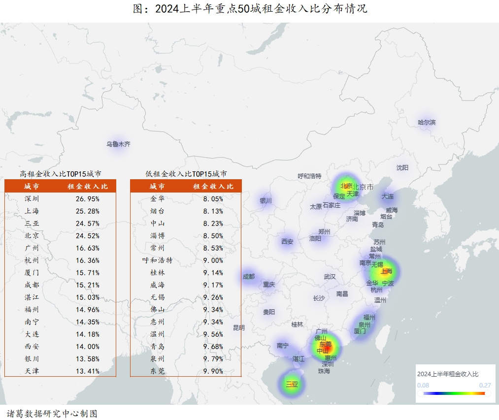 2024年上半年,深圳、上海、三亚、北京是国内租房支出压力最大的四个城市,租金收入比例都在20%以上,但不超过30%。