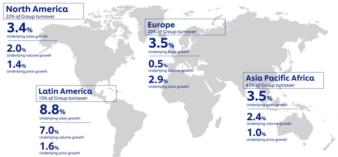 值得注意的是,2023年联合利华亚太和非洲的销售额占总收入的44%,上半年略有下降到43%。不可否认,亚太和非洲仍然是其收入来源最大的市场。