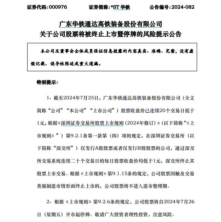 7月25日晚,*ST华铁宣布,2024年7月25日,根据《深圳证券交易所股票上市规则(2024年修订)》(以下简称《上市规则》)第9.25日,公司股票收盘价已连续20个交易日低于1元。.第一款第(四)项规定,深圳证券交易所(以下简称“深圳证券交易所”)仅发行a股股票或仅发行B股股票的企业,深交所停止其股票上市交易,通过深交所交易系统连续20个交易日的每日股票收盘价低于1元。