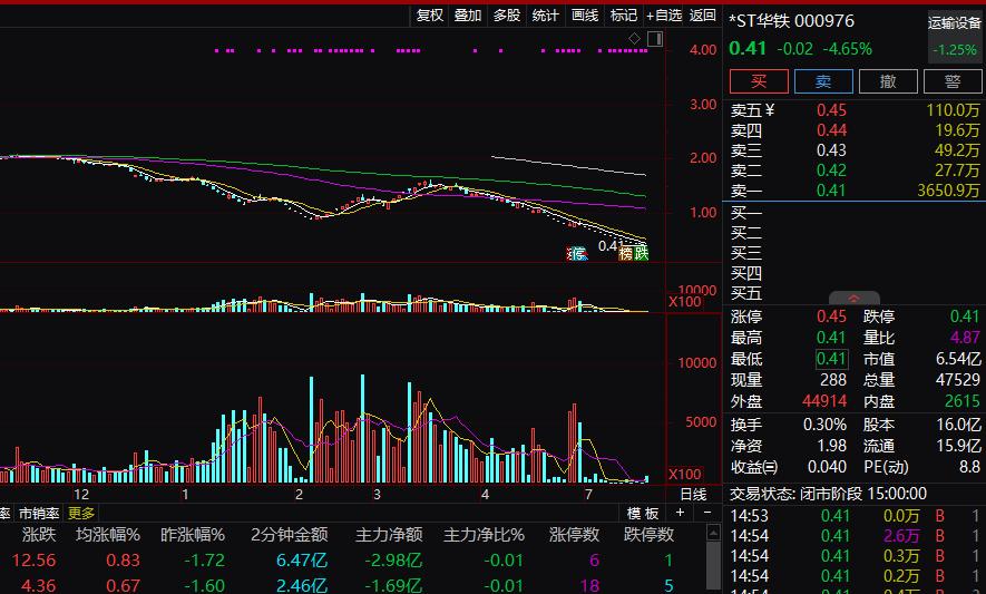 *ST华铁近期股价持续下跌,7月25日再次下跌,最新股价为0.41元。自今年以来,该公司股价累计下跌超过70%。根据Wind数据,该公司股价自历史高点以来的最大跌幅已超过97%。