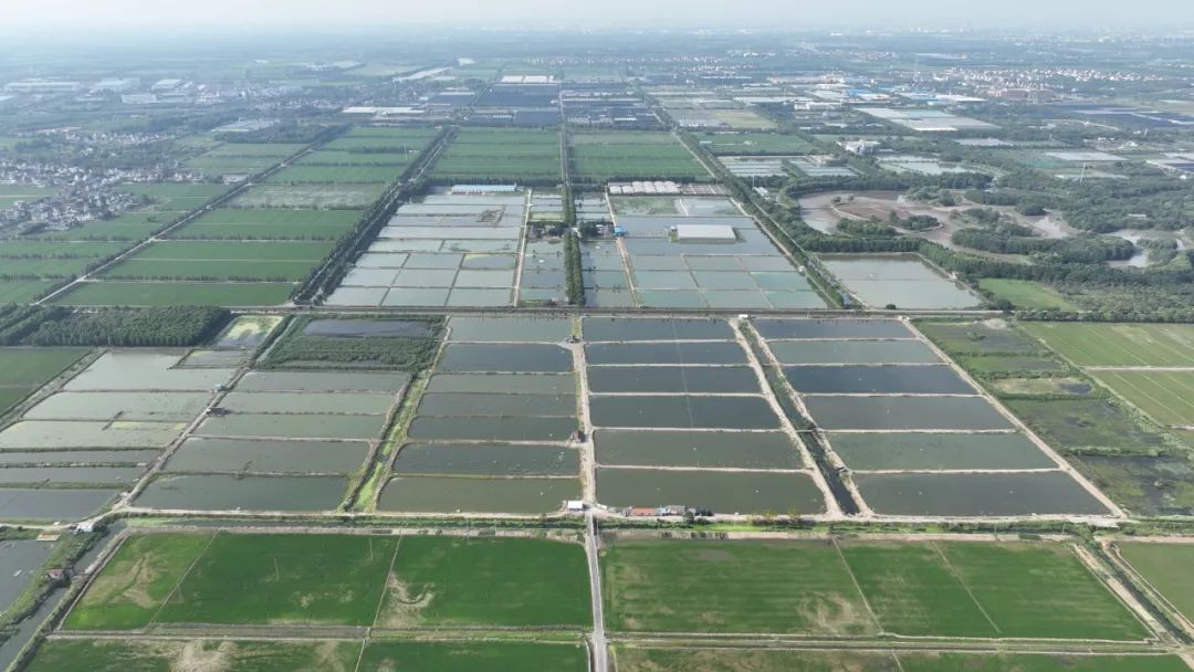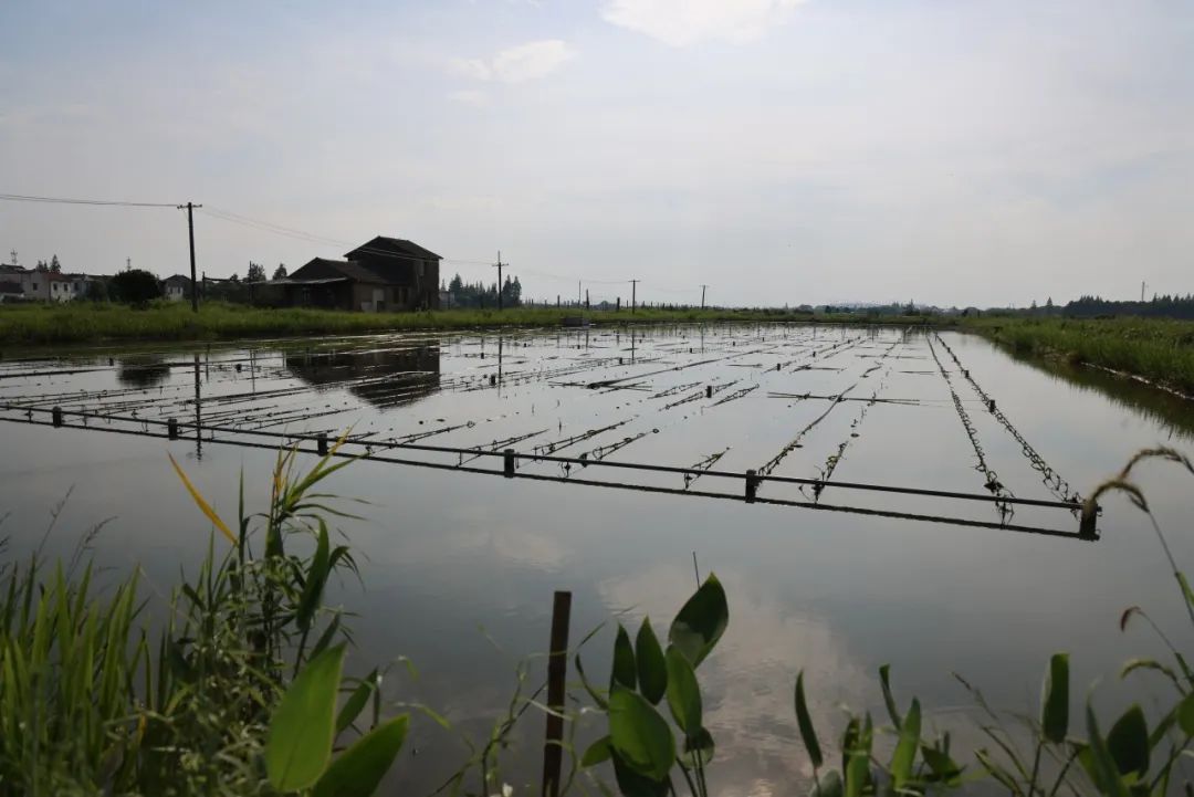 前几天,在枫泾镇韩坞村,一个方形的虾塘微微波光粼粼,像镜子一样铺在绿色的稻田里。虾塘边的空气中弥漫着淡淡的虾味和水生植物的新鲜。