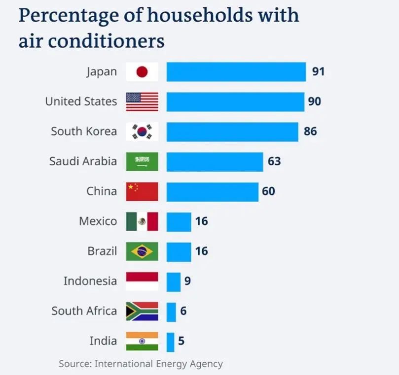 根据国际能源署的数据,从安装总量来看,中国、美国和日本分别占据前三名,三国总和占全球空调安装总量的67%。;日本、美国、韩国、沙特阿拉伯和中国在人均空调安装方面各占前四,与排名第六的墨西哥形成悬崖式差距。