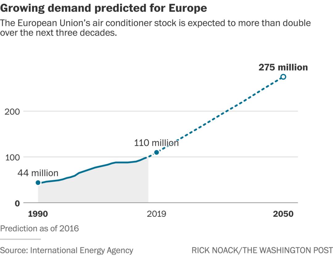 法国和欧洲的空调需求在热浪下迅速升温。根据国际能源组织的预测,欧洲的空调需求从1990年的4400万增长到2019年的1.1亿,到2050年,这一需求将达到2.75亿。
