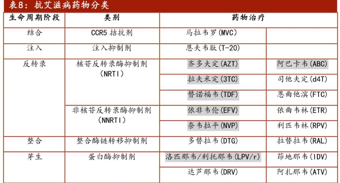 此后,药企不断探索研究,提高用药依从性,提高药品安全耐受性,新药层出不穷,形成6大类50多种药品,包括:核苷类反转录酶抑制剂(NRTIs)、非核苷类反转录酶抑制剂(NNRTIs)、蛋白酶抑制剂(PIs)、综合酶抑制剂(INSTIs)、膜融合抑制剂(FIs)、CCR5拮抗剂 (CCR5抑制剂)。