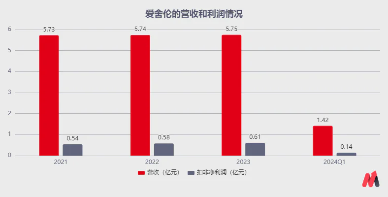 在上述情况下,爱舍伦的利润连续三年维持在5.7亿元左右,扣除的非净利润约为0.6亿元。2021-2023年实现营收分别为5.73亿元、5.74亿元和5.75亿元,扣除的非净利润分别为0.54亿元、0.58亿元和0.61亿元。