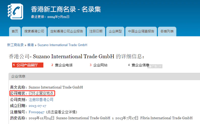 数据显示,u200c公司主要从事国际贸易业务,未发现u200c的具体业务范围和主要活动。u200c不过,根据香港名录收集的数据,u200cSuzano International Trade 2024年6月29日,GmbH被标记为已经停业。说实话,在这里,爱舍伦或者需要更多的信息来公开这家公司的信息,吃了一惊。