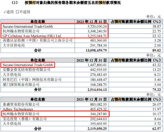 根据招股书,2023年前五名预付款目标占89%,远远超过2021年和2022年的62%和75%。其中,Suzano International Trade Gmbh、杭州翰永物资有限公司,GP Cellulose Asia Marketing (HK) Ltd.对于报告期内预付款额度大幅上升的公司,需要重点讨论。