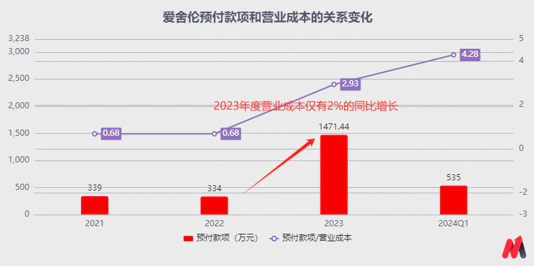 公司2023年预付款1471.44万元,同比增长340%;但是同期运营成本仅同比增长2%,预付款/运营成本比直接上升到0.68%至2.93%。