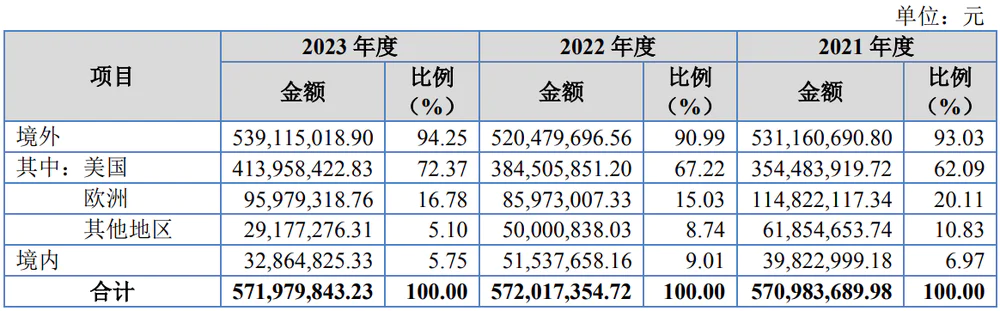 除此之外,公司的大型客户集中在美国、欧洲、韩国等国家和地区,地缘政治风险发生了很大变化。数据显示,2021年、2022年和2023年,公司海外主营业务收入分别为5.31亿元、5.2亿元和5.39亿元,占本期主营业务收入的93.03%。、90.99%、94.25%。