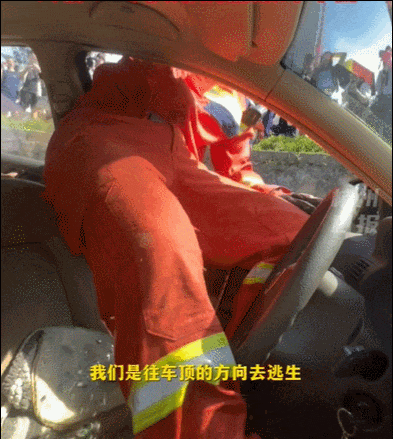 此时,车内的水已没有到达膝盖。在清理了边缘的碎渣后,被困人员依次爬上车顶,成功逃脱。