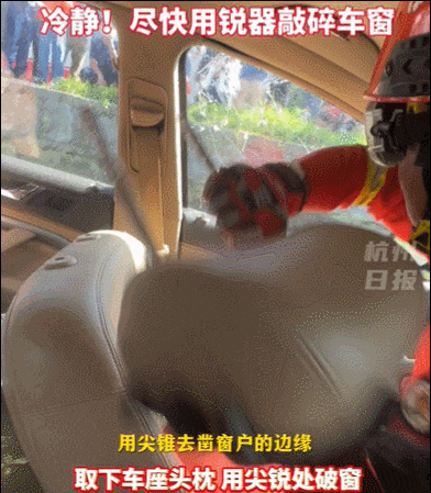 打碎窗户也有技巧。前后窗玻璃最硬最厚,人在车内很难打碎。因此,如果你想优先打碎两侧的窗户,你必须从窗户的边缘打碎它们。如果重击后出现裂缝,玻璃很容易打碎。消防队员用头枕作为示范,用力打了二三十下。窗户破了一个洞,整个玻璃一拳就掉了下来。