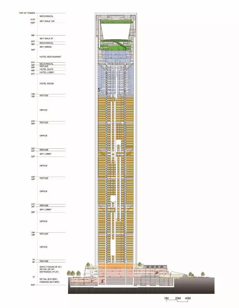 一九九七年八月二十七日,环球中心奠基仪式举行。根据当时的规划,环球中心由地下3层和地上94层组成,高460米,当时算是「世界上最高的建筑」。没想到,随后亚洲金融危机爆发,全球中心建设暂停。六年后,项目重新启动,但当时460米不再是「世界第一高」。