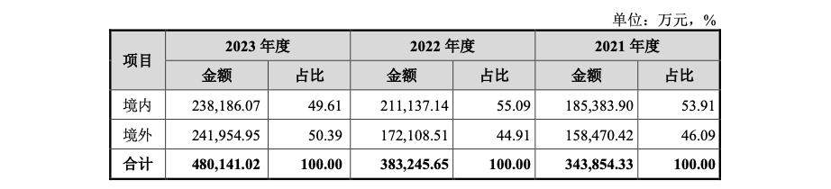 招股书显示,2021-2023年(以下简称:报告期),绿联科技主营业务中来自海外的部分逐步超越国内,各自约15.85亿元、17.21亿元、24.20亿元;分别占46.09%、44.91%、50.39%,主要产品继续当选亚马逊平台上最畅销的产品,亚马逊的选择等等。
