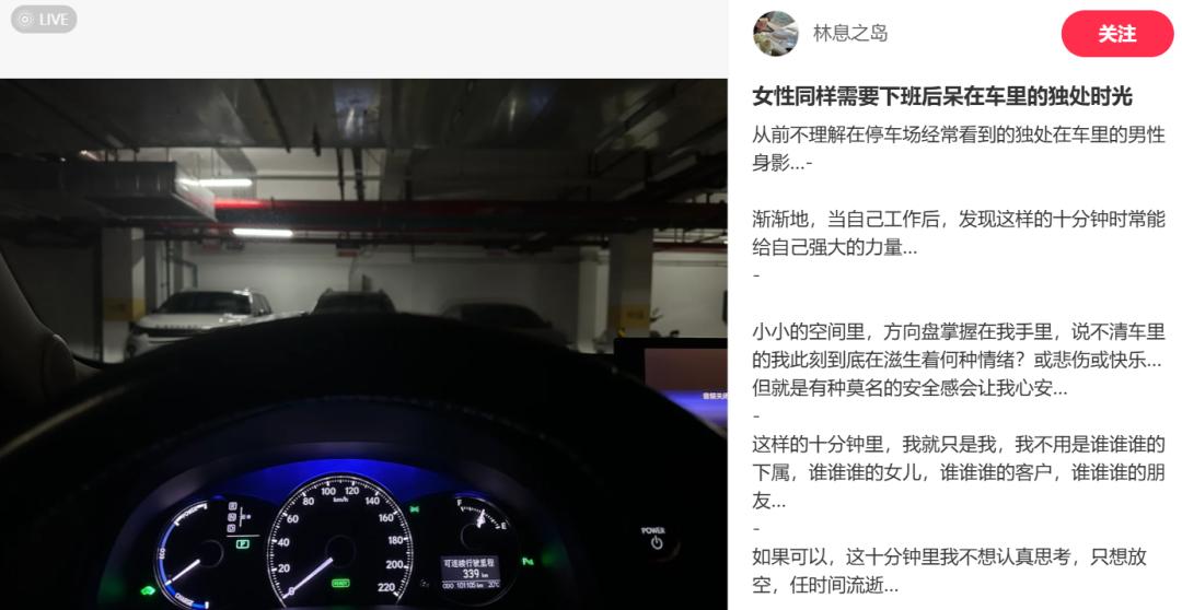上面有20分钟的公园效应,后面有20分钟的车内效应。在生活和办公室的小缝隙中,工人使用gapp。 Moment释放疲劳;呆在车里放松成了他们安慰自己的秘诀,即使只呆一会儿,也能带来强大的力量。