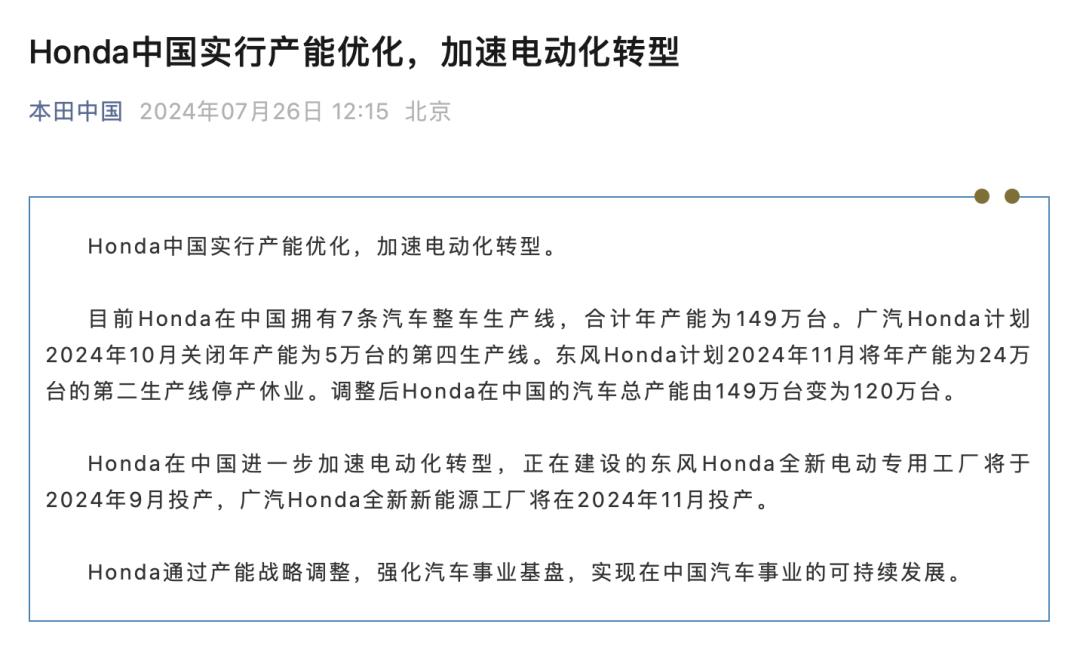 今天,本田中国也回应称,目前本田在中国拥有7条汽车生产线,年产能总额为149万台。广汽本田计划在2024年10月关闭年产能5万台的第四条生产线。东风本田计划在2024年11月关闭年产能24万台的第二条生产线。