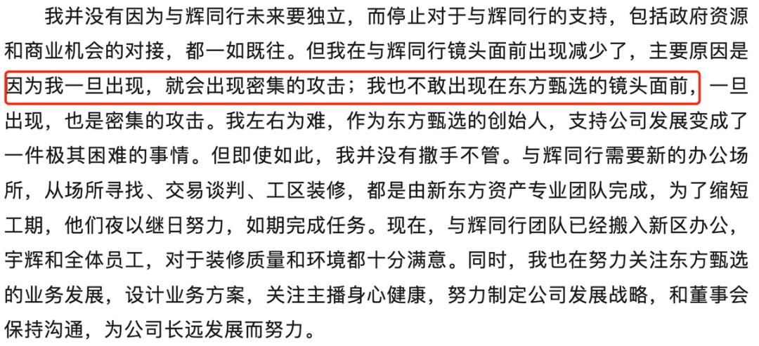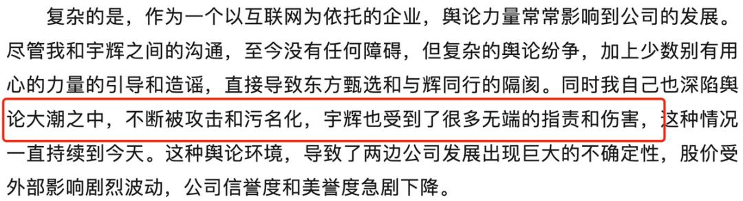 虽然我们不知道背后的真正原因,但俞敏洪的自我报告表现出了委屈、纠结和无奈。海豚君认为,可能来自新东方股东的压力(直播中经常发生雷点事件,影响市值稳定),以及东方选拔中的组织问题(集团老人对董宇辉的认可,对董孙事故处理结果的不满等。).
