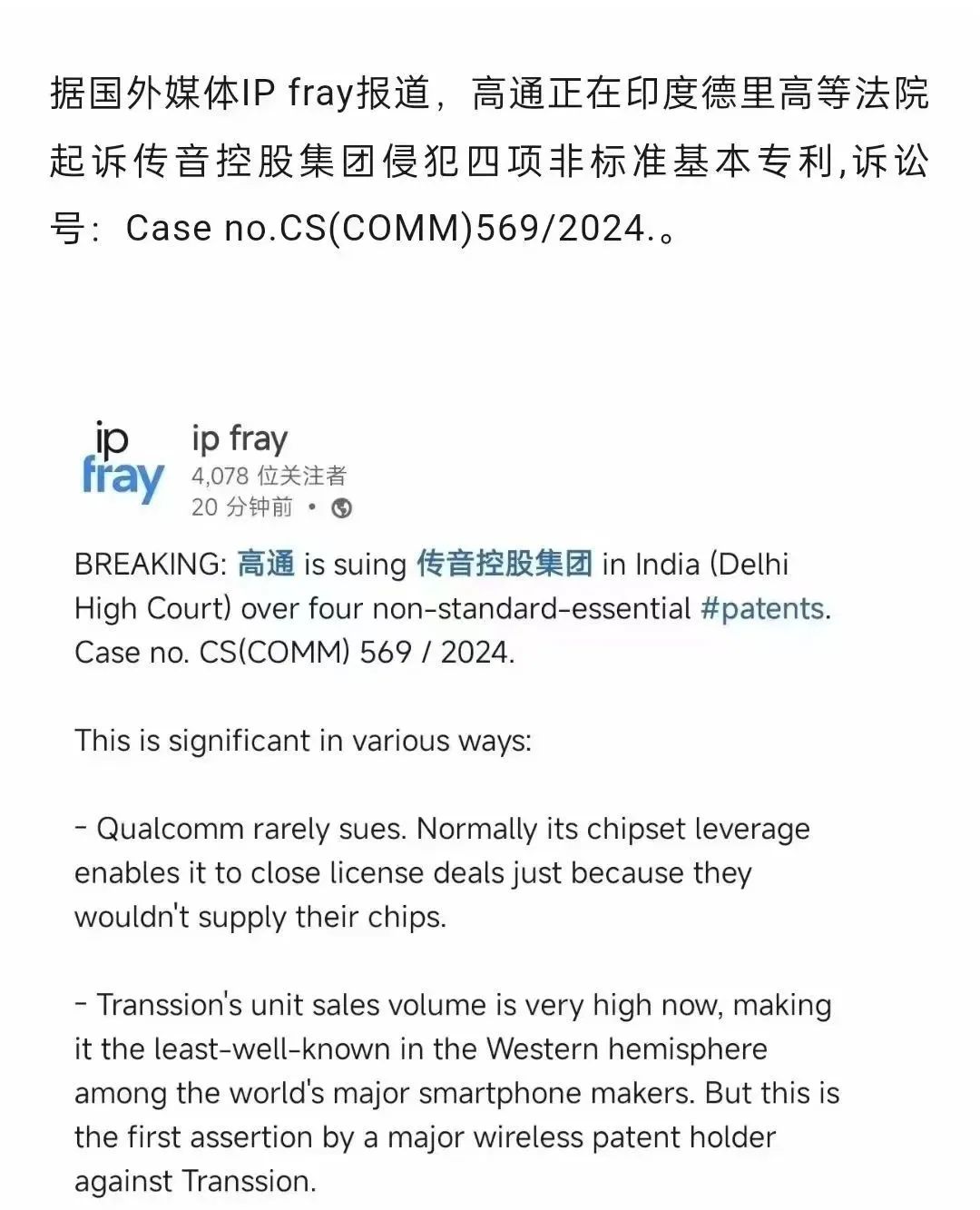 高通发表声明称,传音控股最近与高通签订了一些产品的许可协议,但其大部分产品尚未获得高通的许可,仍在侵犯高通有价值的专利组合。