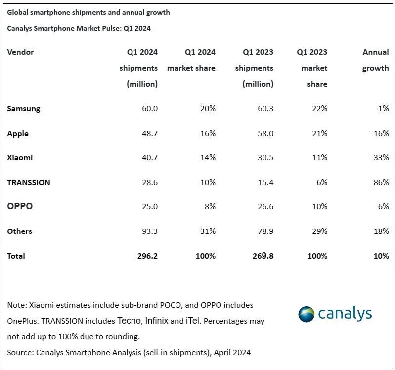 研究机构Canalys数据显示,2023年三星在非洲地区的出货量排名第二,为1770万部,市场份额为26%,同比下降12%。但传音出货量却增长了12%,达到3450万部,市场份额为50%,同比增长了8%。仅2024年Q1,传音手机出货量就达到了2860万部,市场份额为10%,相继实现了86%的增长。