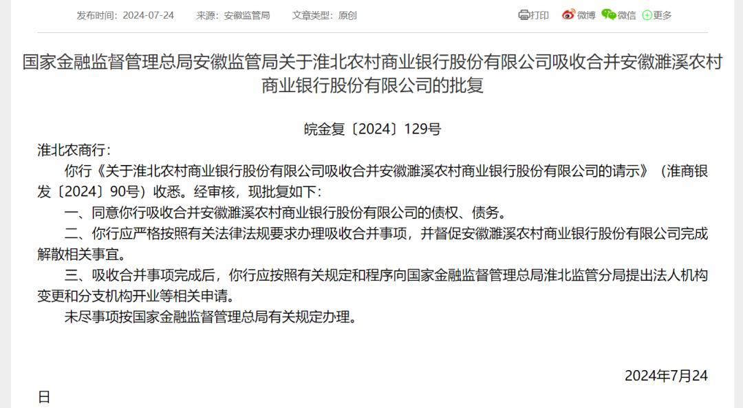 7月24日,国家金融监督管理总局安徽监管局发布批复显示,同意淮北农村商业银行吸收并合并农村商业银行的债务和负债。