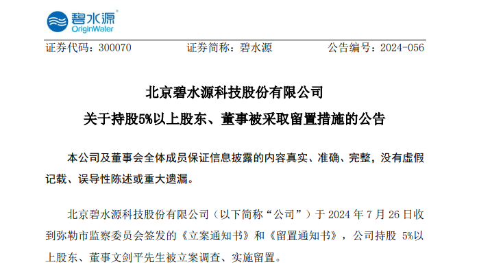 7月26日晚,碧水源宣布,该公司于2024年7月26日收到弥勒市监察委员会发布的《立案通知书》和《留置通知书》,该公司持有超过5%的股东和董事文剑平先生被立案调查并实施留置。