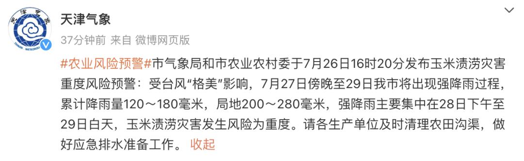 7月26日16时20分,市气象局和市农业农村委员会发布玉米涝灾害重大风险预警:受台风“格美”影响,7月27日晚至29日,我市将出现强降雨过程,累计降水量为120。~180mm,局地200~280mm,强降水主要集中在28日下午至29日的白天,玉米渍涝灾害的危险性很大。要求各生产企业及时处理田地水渠,做好紧急排水准备。