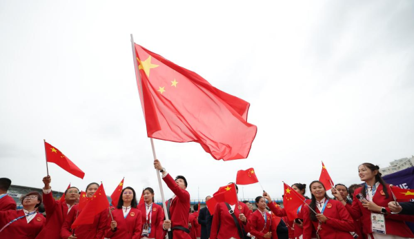 在中国代表团的游轮上,乒乓球运动员马龙和花样游泳运动员冯雨高擎五星红旗在登船口接受采访时表示,他非常兴奋和自豪。中国体育代表团由716名选手组成,其中405名选手将参加30个大项目和236个小项目的比赛,这是历届海外奥运会中最受欢迎的项目。