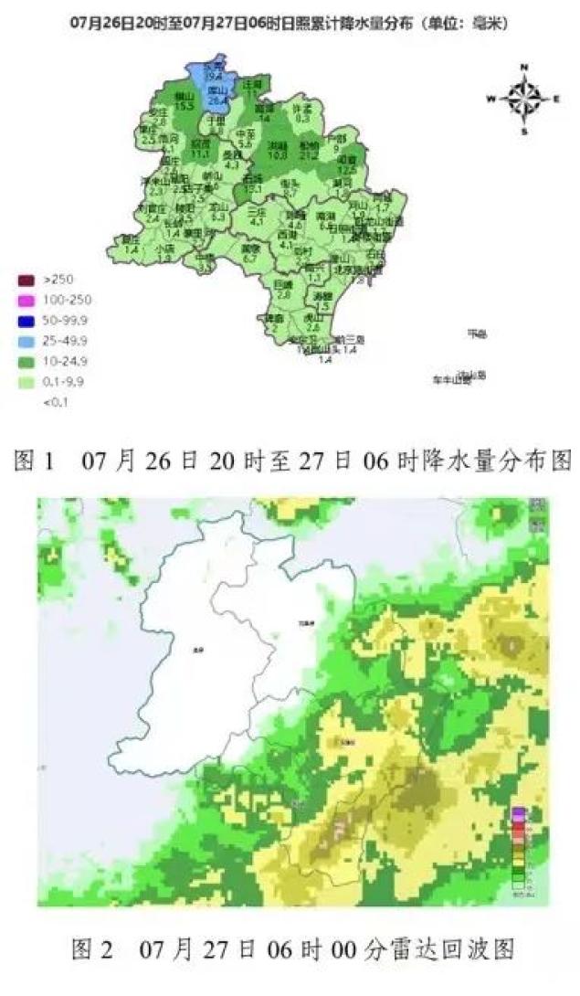 两个乡镇街道发生暴雨(25)~50mm),8个乡镇街道出现中雨(10mm)~25mm),其它乡镇街道出现小雨(0.1~10mm)。