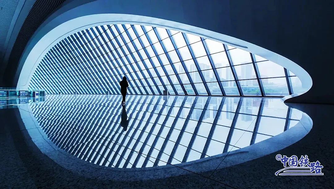 站房候车大厅由内向外看,圆弧形玻璃幕墙像眼睛一样明亮,被市民亲切地称为“重庆之眼”,意味着重庆西站是重庆通往世界的新窗口和新视野。走在里面,钢筋和人物之间形成了极好的光影美。
