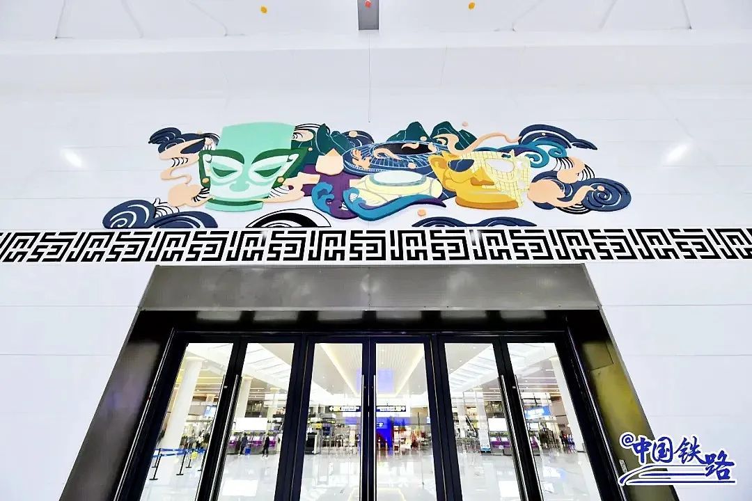 成都东站的设计理念与巴蜀文化完美结合。柱形来源于三星堆出土的文物青铜面具造型,也巧妙地融入了川西风格的竹幕墙和汉蜀文化的宫阙雕刻元素,让每年数千万游客与巴蜀文化亲密接触。
