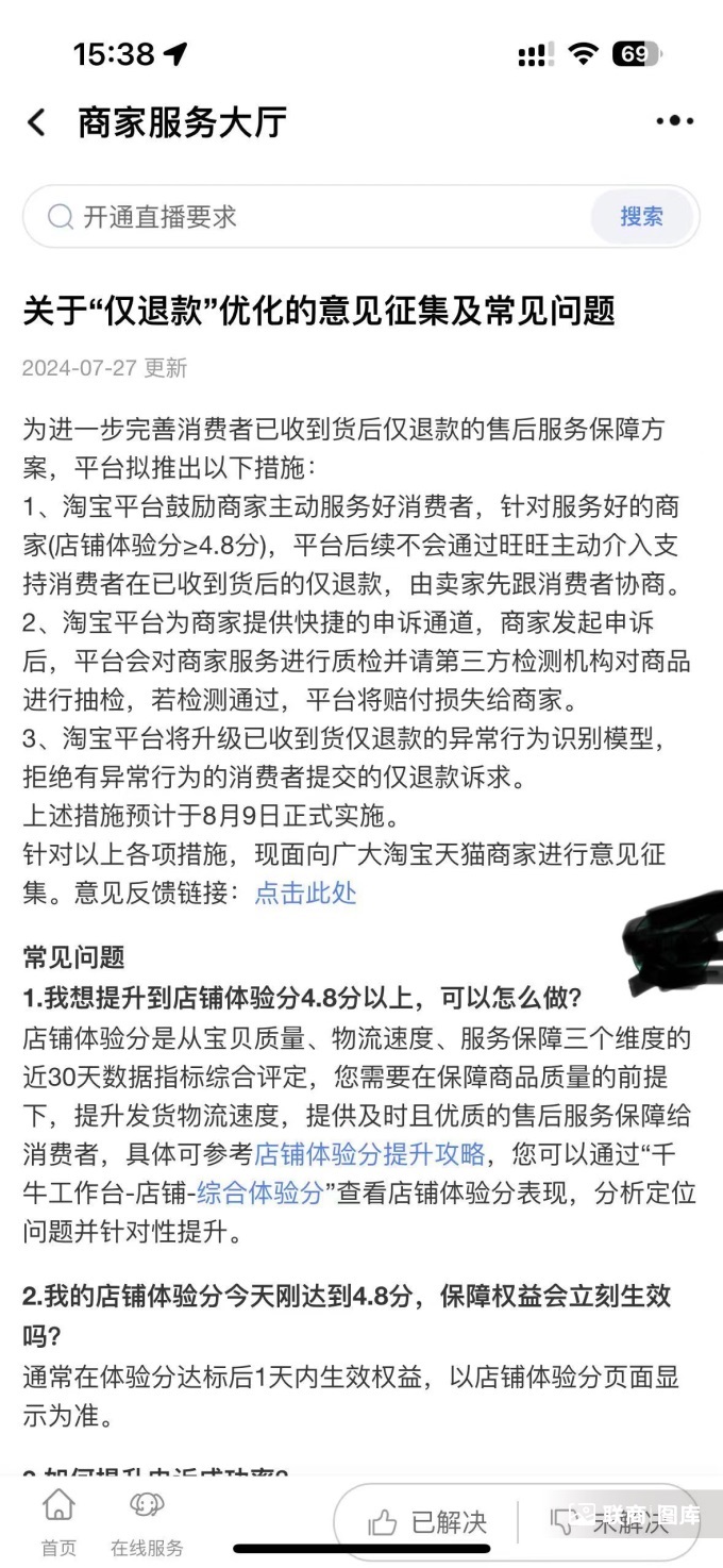 据报道,策略上线后,对店铺综合体验进行评分。≥对于4.8分的商家,平台不会主动通过旺旺介入,收到货后只支持退款,而是商家先和消费者商量。对于其他分段的商家,平台会根据感受点和行业性质给予一定程度的自主处置权。感受点越高,商家处置权越大。