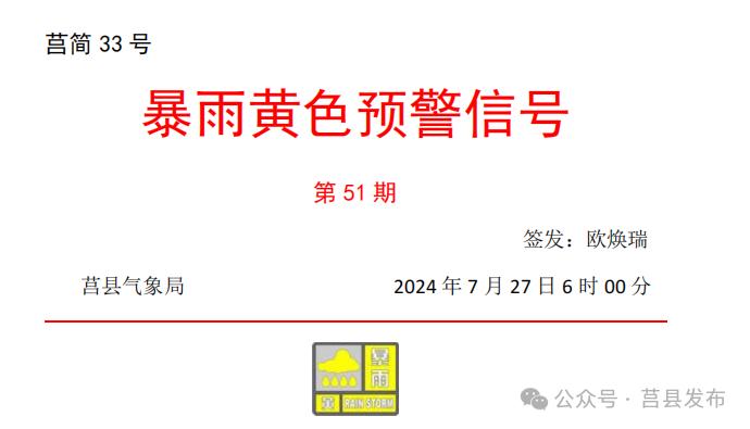 2024年7月27日6时00分,兖县气象台发布了黄色暴雨预警信号:目前兖县东莞镇6小时降水量已达46.1mm,估计从白天到晚上,兖县的降水还会继续,请注意预防。