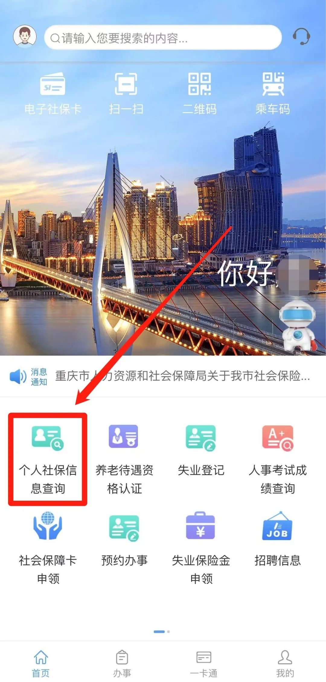 ① 登陆“重庆人社”APP,首页可以找到“个人社保信息查询”图标,点击查看并选择“养老保险”。