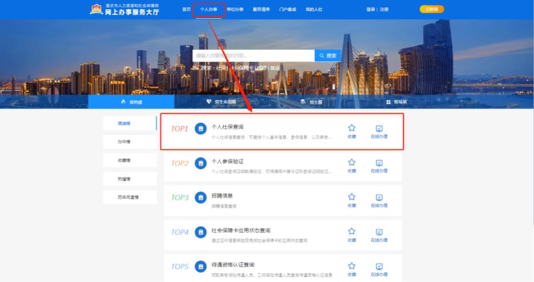 ① 登录官网“重庆智能人力资源和社会保障网办大厅”(点击查看),在网站首页找到“个人工作”-“社保”的“个人社保查询”选项,点击“线上办理”。