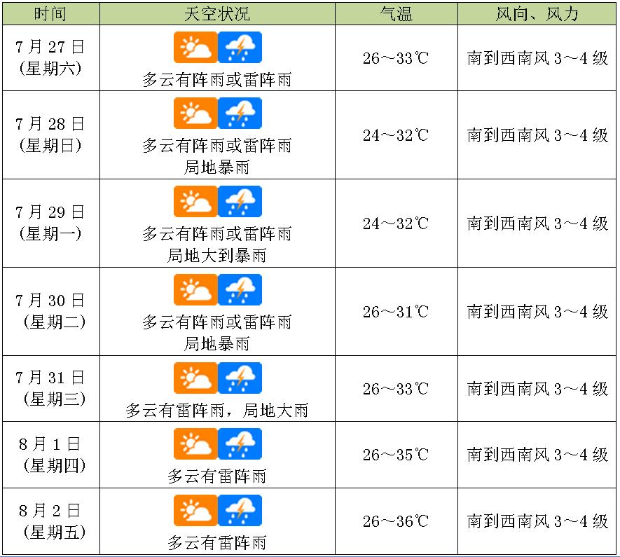 根据海口市气象台的消息,7月27日和8月1日~2日,受南至西南气流影响,海口以多云天气为主,下午有雷暴,可能伴有强对流天气,主要是短期强降水。最高气温33~36℃。7月28日~31日,由于低空切变线的影响,海口阴天有阵雨或雷暴,局部有大到暴雨。最高气温31~33℃,最低温度变化不大。