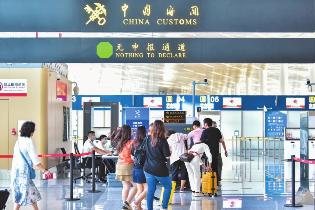 7月24日,出境旅客在海口美兰国际机场T2航站楼国际和港澳台出发大厅通过海关安检。苏坤 摄