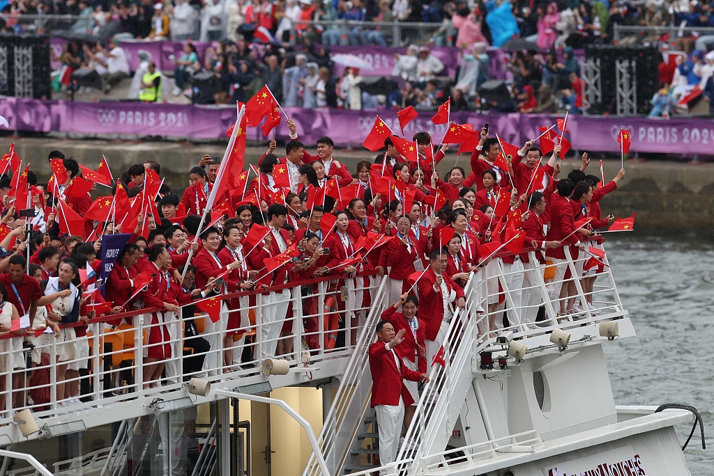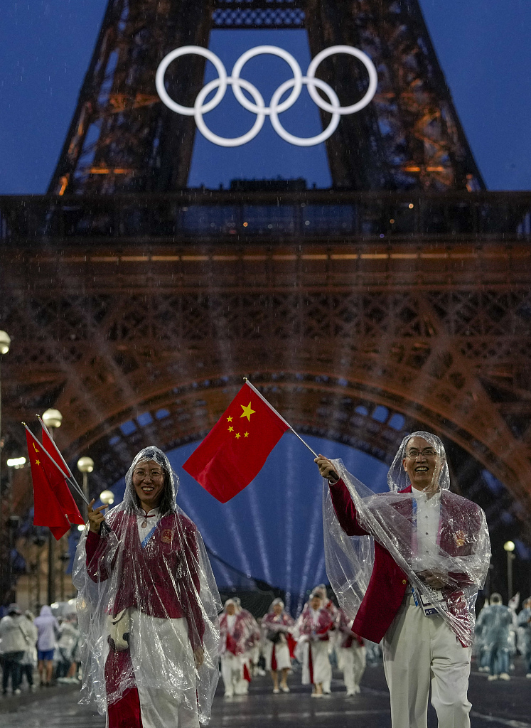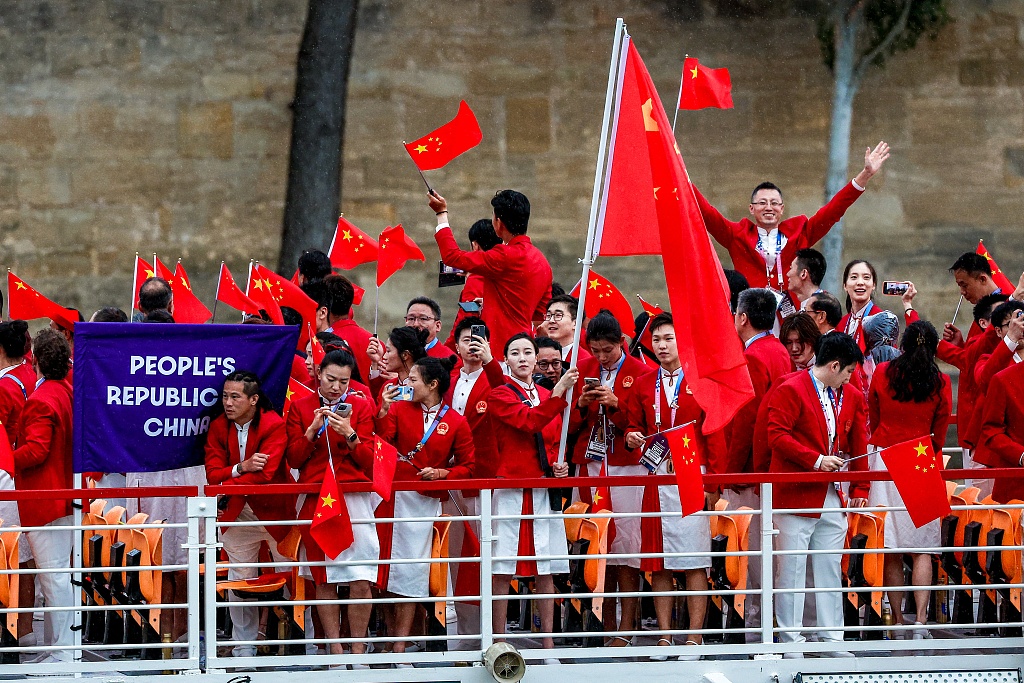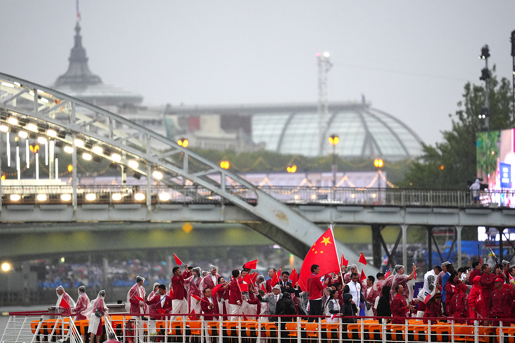 2024年7月26日,法国巴黎、巴黎奥运会开幕式上,中国代表团进场。