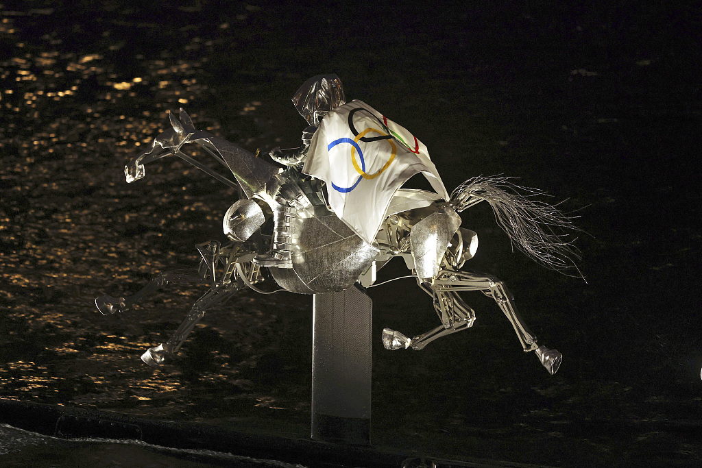 2024年7月26日,法国巴黎奥运会开幕式上,一名女骑手穿着银色盔甲骑马穿过塞纳河后,在特罗卡德罗广场献上了奥林匹克旗帜。