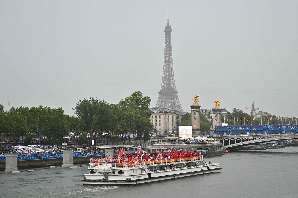 2024年7月26日,法国巴黎、巴黎奥运会开幕式上,各国代表团乘坐不同颜色的船只,沿着塞纳河航行。