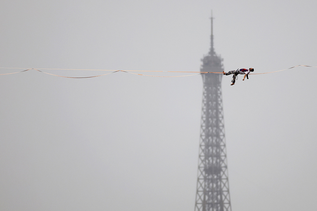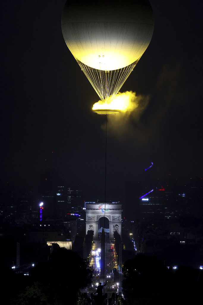 2024年7月26日,法国巴黎,巴黎奥运会开幕式,奥运主火炬被点燃后缓缓起飞。