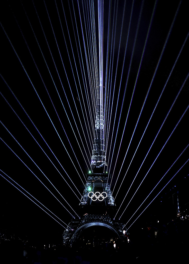 2024年7月26日,法国巴黎、巴黎奥运会开幕式上,灯光在埃菲尔铁塔上流动,奥林匹克五环标志也亮起。