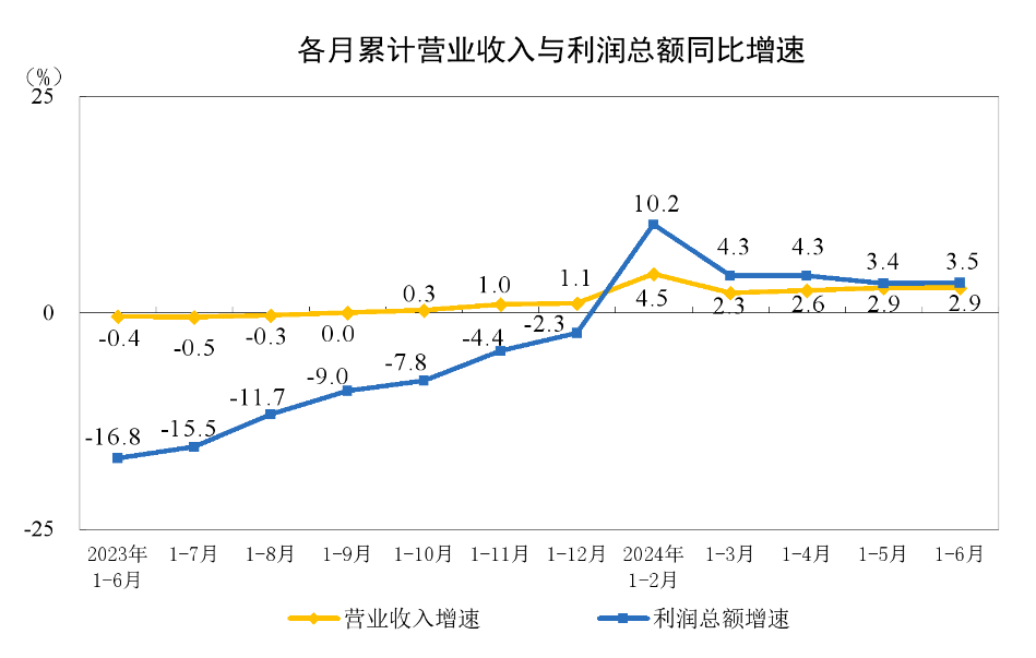 根据国家统计局的数据,1-6月,全国规模以上工业企业实现利润总额35110.3亿元,同比增长3.5%。其中,6月份工业企业利润增长3.6%,比5月份增长2.9%。%。