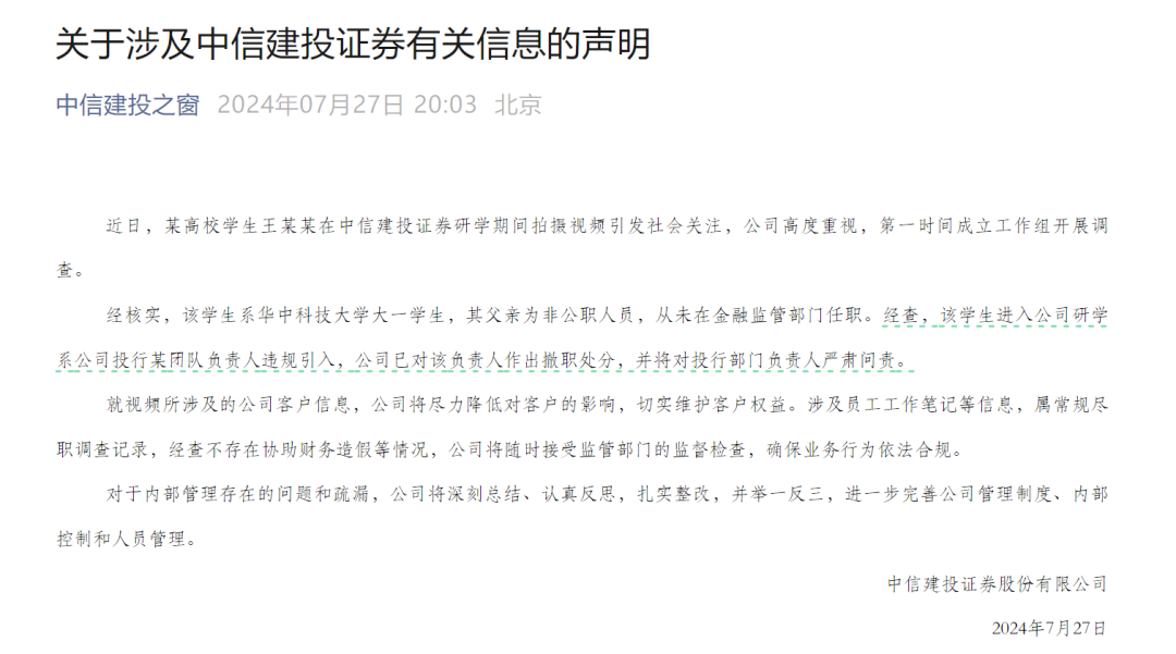 7月27日,中信建投在最新声明中表示,经核实,该学生为华中科技大学大一新生,其父亲为非公职人员,从未在金融监管部门工作过。经调查,该学生进入中信建投研究系公司投资银行某团队负责人非法引进。中信建投对该负责人进行了撤职处分,并将严肃追究投资银行部门负责人的责任。